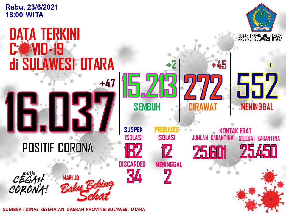 Untuk hari ini Rabu , 23 Juni 2021, kami update pertambahan kasus terkonfirmasi positif sejumlah 47 kasus.