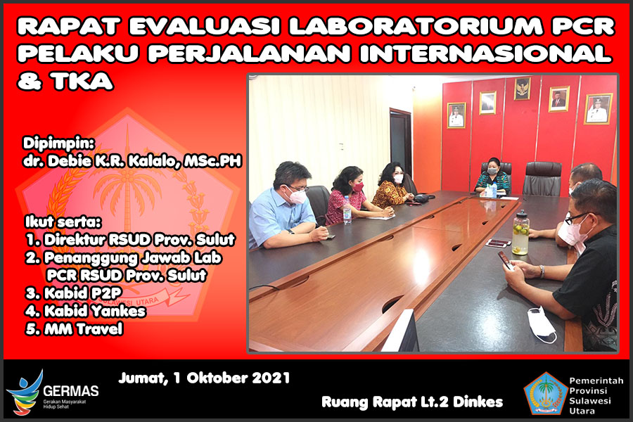 Manado - Kepala Dinas Kesehatan Daerah Provinsi Sulawesi Utara mengadakan Rapat Evaluasi Laboratorium PCR Pelaku Perjalanan Internasional dan TKA yang dilaksanakan di Ruang Rapat Lantai 2 Dinas Kesehatan Daerah Provinsi Sulawesi Utara pada hari Jumat 1 Oktober 2021 pukul 10.00 WITA. Rapat tersebut berlangsung sehubungan dengan kegiatan PCR di Bandara Sam Ratulangi Manado. Turut hadir dalam rapat Direktur RSUD Provinsi Sulawesi Utara, Penanggung Jawab Laboratorium PCR RSUD Provinsi Sulawesi Utara, Kepala Bidang Pencegahan & Pengendalian Penyakit, Kepala Bidang Pelayanan Kesehatan, dan MM Travel.